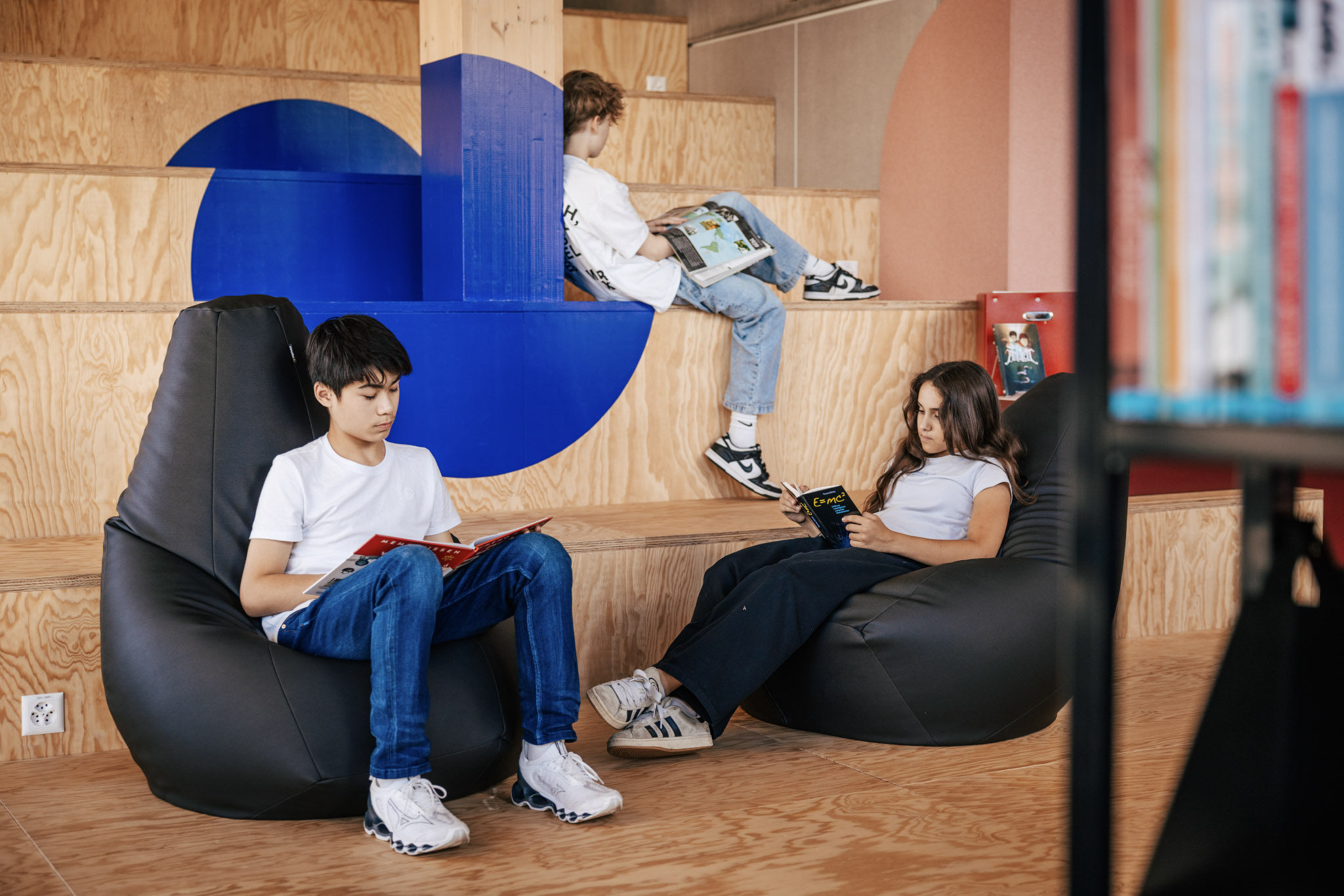 Die Mediothek der KS Rotkreuz ist direkt beim Eingang im Erdgeschoss. Sie enthält eine Ausleihtheke, Bücherregale, eine kleine Lounge, einige Arbeitsplätze am Fenster und eine Sitztreppe mit einer kleinen Bühne davor.